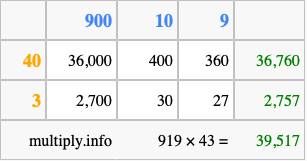 That's all there is to it! As you can see from the box above, the answer to 919 times 43 using the box method is 39,517.