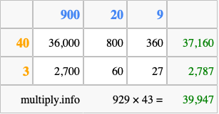 Below is an illustration showing you how to calculate 929 times 43 using the box method, using the instructions above.