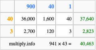 That's all there is to it! As you can see from the box above, the answer to 941 times 43 using the box method is 40,463.