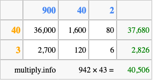 Finally, we add up all the sums we found in step 3 to get our final answer to 942 times 43.