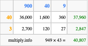 Below is an illustration showing you how to calculate 949 times 43 using the box method, using the instructions above.