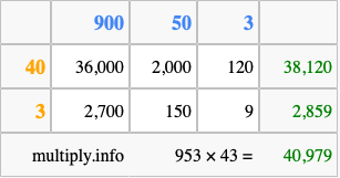 Finally, we add up all the sums we found in step 3 to get our final answer to 953 times 43.