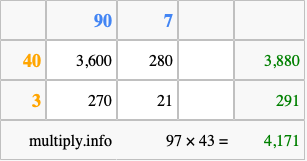 Finally, we add up all the sums we found in step 3 to get our final answer to 97 times 43.
