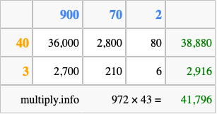 That's all there is to it! As you can see from the box above, the answer to 972 times 43 using the box method is 41,796.