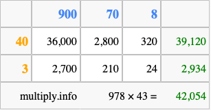 That's all there is to it! As you can see from the box above, the answer to 978 times 43 using the box method is 42,054.