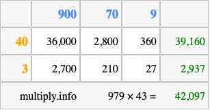 That's all there is to it! As you can see from the box above, the answer to 979 times 43 using the box method is 42,097.
