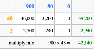 That's all there is to it! As you can see from the box above, the answer to 980 times 43 using the box method is 42,140.