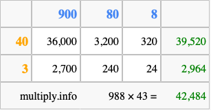 That's all there is to it! As you can see from the box above, the answer to 988 times 43 using the box method is 42,484.