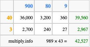 That's all there is to it! As you can see from the box above, the answer to 989 times 43 using the box method is 42,527.