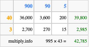 That's all there is to it! As you can see from the box above, the answer to 995 times 43 using the box method is 42,785.