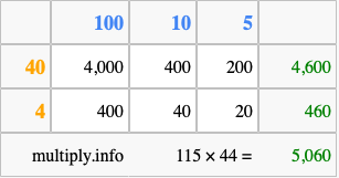 Finally, we add up all the sums we found in step 3 to get our final answer to 115 times 44.