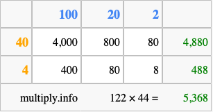 Below is an illustration showing you how to calculate 122 times 44 using the box method, using the instructions above.