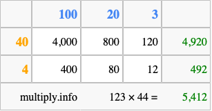 Below is an illustration showing you how to calculate 123 times 44 using the box method, using the instructions above.