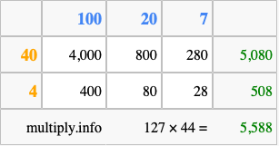 That's all there is to it! As you can see from the box above, the answer to 127 times 44 using the box method is 5,588.
