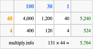 That's all there is to it! As you can see from the box above, the answer to 131 times 44 using the box method is 5,764.