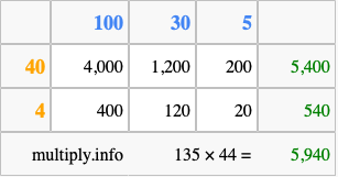 Finally, we add up all the sums we found in step 3 to get our final answer to 135 times 44.
