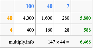 Finally, we add up all the sums we found in step 3 to get our final answer to 147 times 44.