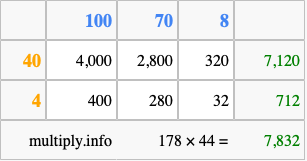 Below is an illustration showing you how to calculate 178 times 44 using the box method, using the instructions above.