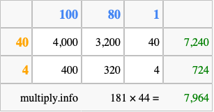 That's all there is to it! As you can see from the box above, the answer to 181 times 44 using the box method is 7,964.