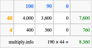 Below is an illustration showing you how to calculate 190 times 44 using the box method, using the instructions above.