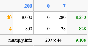 Finally, we add up all the sums we found in step 3 to get our final answer to 207 times 44.