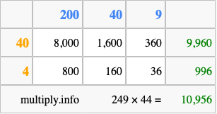 Finally, we add up all the sums we found in step 3 to get our final answer to 249 times 44.