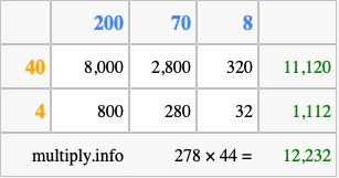 That's all there is to it! As you can see from the box above, the answer to 278 times 44 using the box method is 12,232.