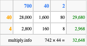 Finally, we add up all the sums we found in step 3 to get our final answer to 742 times 44.