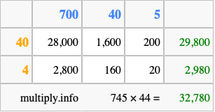 Finally, we add up all the sums we found in step 3 to get our final answer to 745 times 44.
