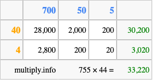 That's all there is to it! As you can see from the box above, the answer to 755 times 44 using the box method is 33,220.