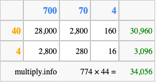 That's all there is to it! As you can see from the box above, the answer to 774 times 44 using the box method is 34,056.