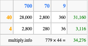 That's all there is to it! As you can see from the box above, the answer to 779 times 44 using the box method is 34,276.