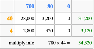 That's all there is to it! As you can see from the box above, the answer to 780 times 44 using the box method is 34,320.