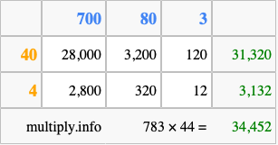 Finally, we add up all the sums we found in step 3 to get our final answer to 783 times 44.