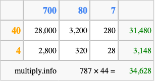 That's all there is to it! As you can see from the box above, the answer to 787 times 44 using the box method is 34,628.