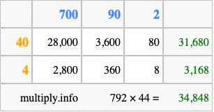 Finally, we add up all the sums we found in step 3 to get our final answer to 792 times 44.