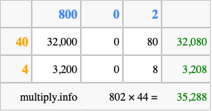 Finally, we add up all the sums we found in step 3 to get our final answer to 802 times 44.