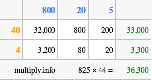 Finally, we add up all the sums we found in step 3 to get our final answer to 825 times 44.