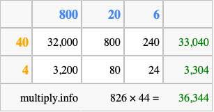 That's all there is to it! As you can see from the box above, the answer to 826 times 44 using the box method is 36,344.