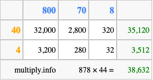 That's all there is to it! As you can see from the box above, the answer to 878 times 44 using the box method is 38,632.