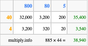 Finally, we add up all the sums we found in step 3 to get our final answer to 885 times 44.