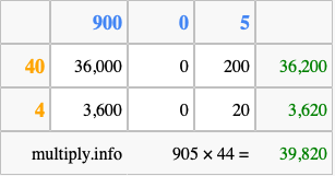 Finally, we add up all the sums we found in step 3 to get our final answer to 905 times 44.