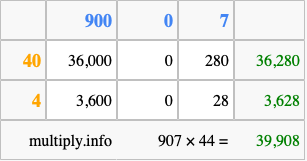 Below is an illustration showing you how to calculate 907 times 44 using the box method, using the instructions above.