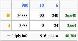 Below is an illustration showing you how to calculate 916 times 44 using the box method, using the instructions above.