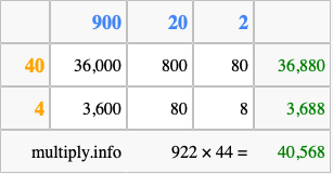 That's all there is to it! As you can see from the box above, the answer to 922 times 44 using the box method is 40,568.
