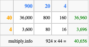 That's all there is to it! As you can see from the box above, the answer to 924 times 44 using the box method is 40,656.