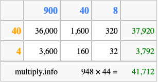 That's all there is to it! As you can see from the box above, the answer to 948 times 44 using the box method is 41,712.