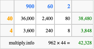 That's all there is to it! As you can see from the box above, the answer to 962 times 44 using the box method is 42,328.