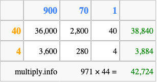That's all there is to it! As you can see from the box above, the answer to 971 times 44 using the box method is 42,724.