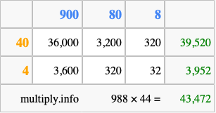 That's all there is to it! As you can see from the box above, the answer to 988 times 44 using the box method is 43,472.